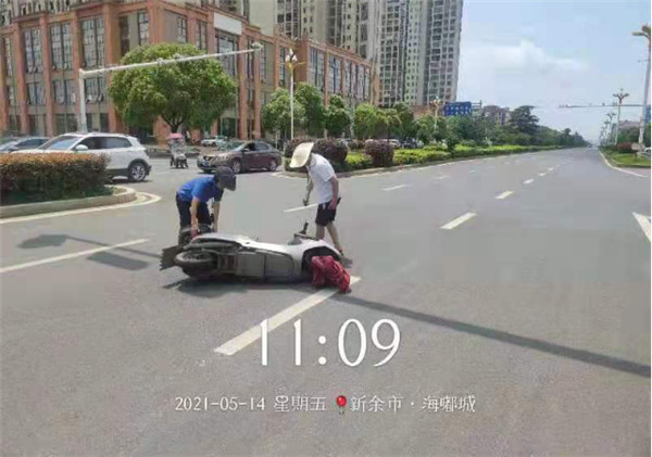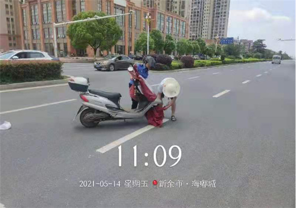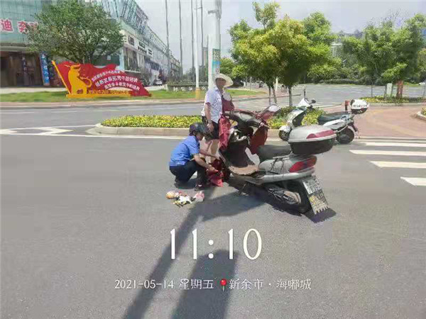 2021年5月14日,公司駐高新區(qū)城市綜合管理大隊隊員王曉輝和彭彧斯正在新城大道進行例行巡查,巡查至賽維大道與新城大道紅綠燈處時,道路中間一倒地的電動車和一名男子引起了兩名隊員的注意,路上車來車往的,男子站在路中間甚是危險,兩名隊員立即上前了解事故原委。