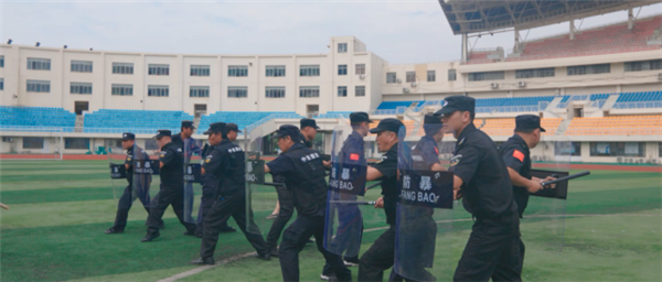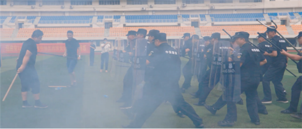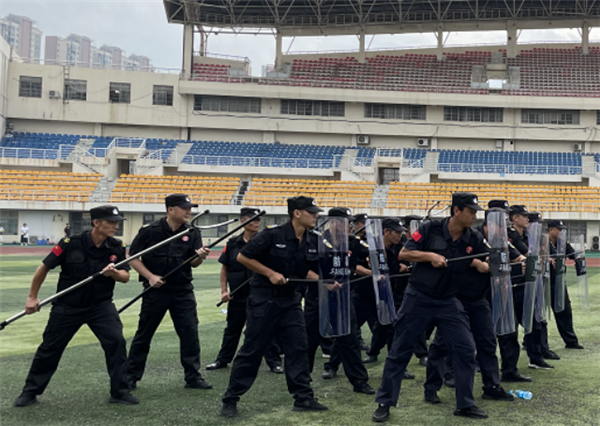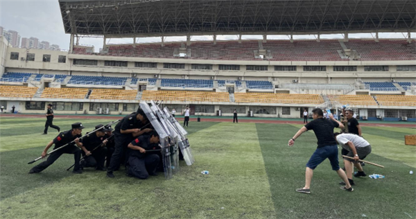 保安員奮起反抗,但鬧事人員眾多未能得到有效控制,值班隊(duì)長(zhǎng)立即向110指揮中心匯報(bào)并向公司請(qǐng)求增援。公司立即啟動(dòng)防恐應(yīng)急預(yù)案,20名特勤中隊(duì)?wèi)?yīng)急防恐小組立即響應(yīng),攜帶防暴裝備到現(xiàn)場(chǎng)進(jìn)行處置,他們迅速成防爆隊(duì)形控制現(xiàn)場(chǎng)局勢(shì)。