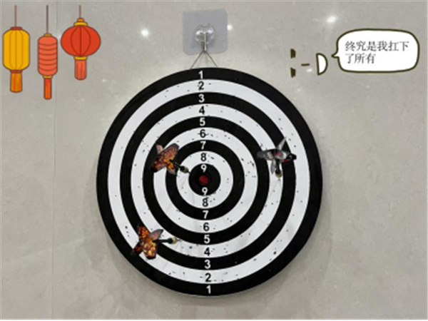 “啊啊啊,五環(huán),你比四環(huán)多一環(huán)”,一個飛鏢游戲把小岳岳的歌都炸出來,倒是應(yīng)景的很。九環(huán)、四環(huán)、兩環(huán),時不時一陣喝彩,還有扔了個寂寞的直言“武的不行,我去整文的了”。只有飛鏢盤在無言的吶喊“終究是我抗下了所有”。